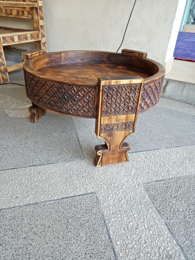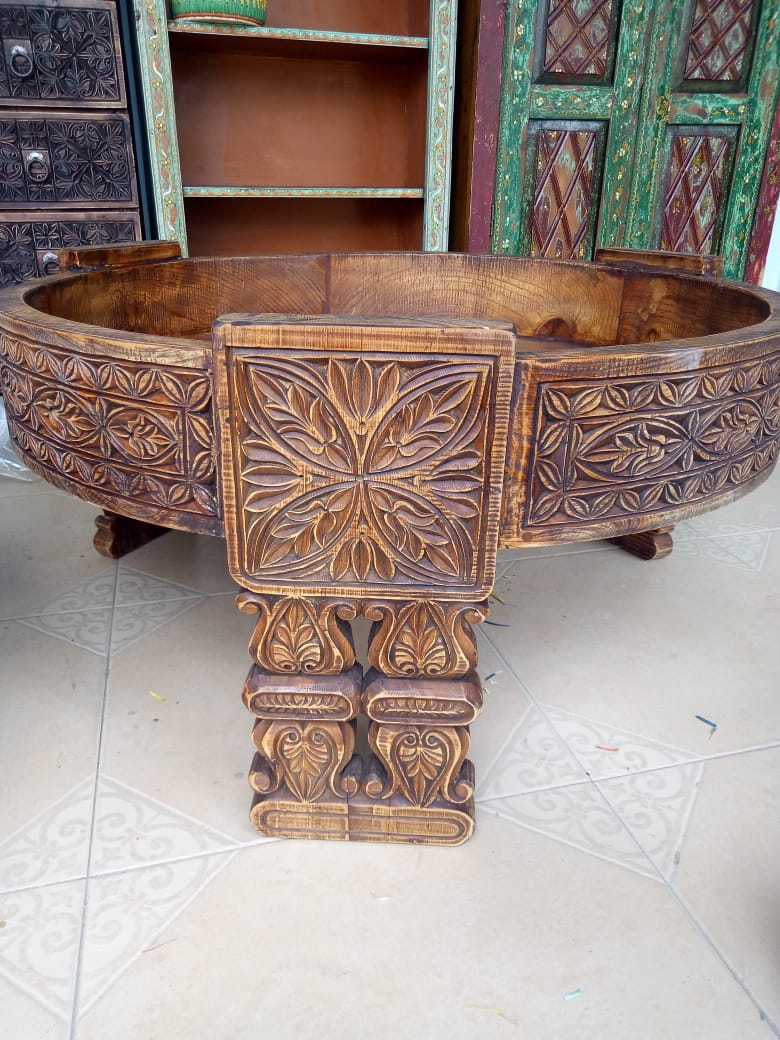 Elevate your living space with the Regal Bloom Table, a masterpiece of ornamental design. Its circular top features intricate floral-inspired patterns, while the golden and white accents on the base add a touch of sophistication. Crafted to be both functional and decorative, this table embodies elegance and tradition, making it the perfect centerpiece for gatherings or a statement piece in your home décor. Whether placed indoors or outdoors, it radiates timeless charm and artistry.