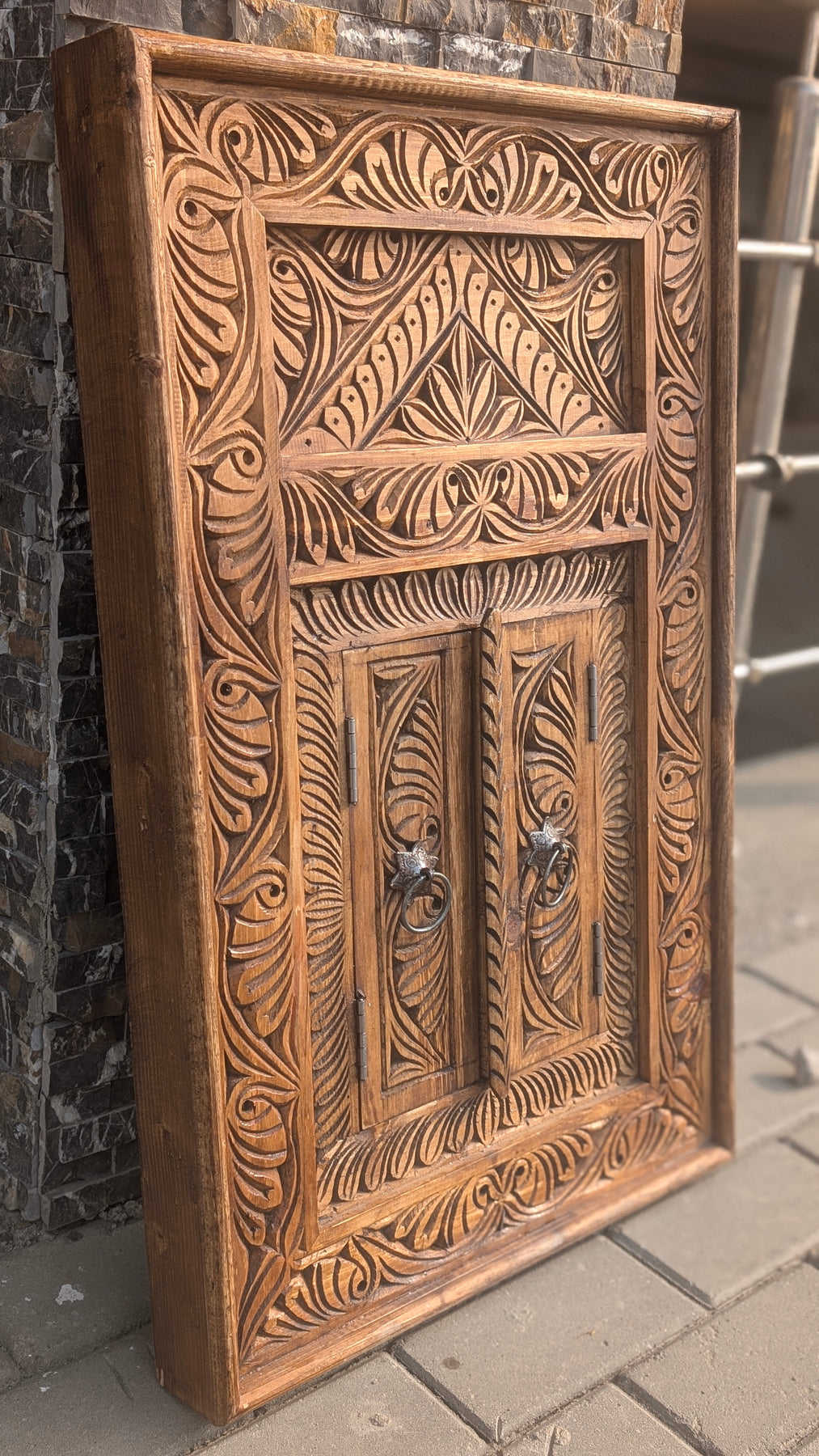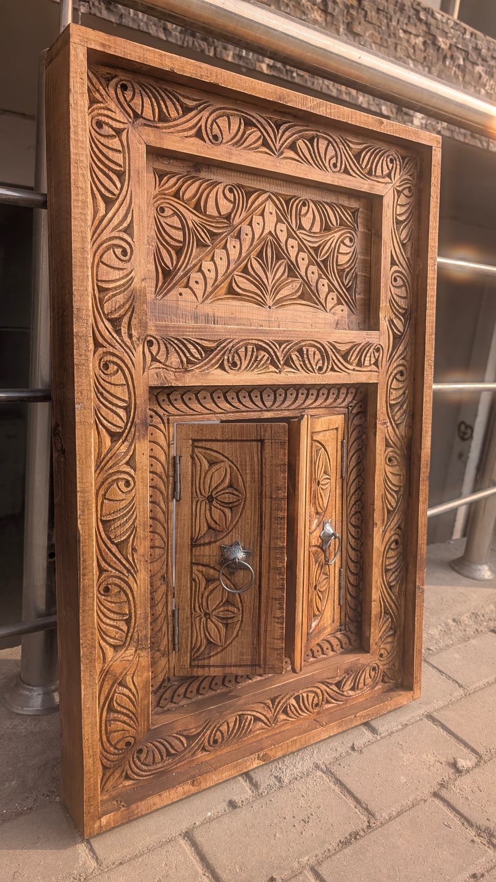 ​Crafted from solid wood with a rich, natural finish, it features intricate floral scrollwork and functional miniature doors that open to reveal a space perfect for a mirror or a small portrait.