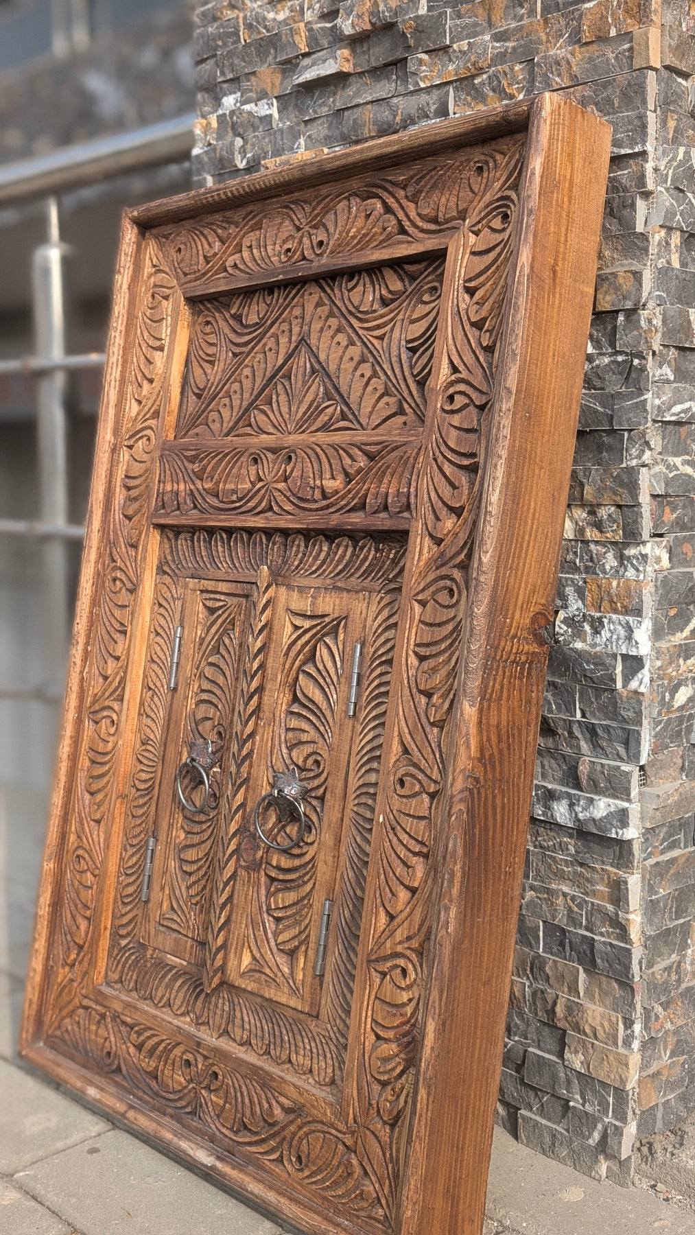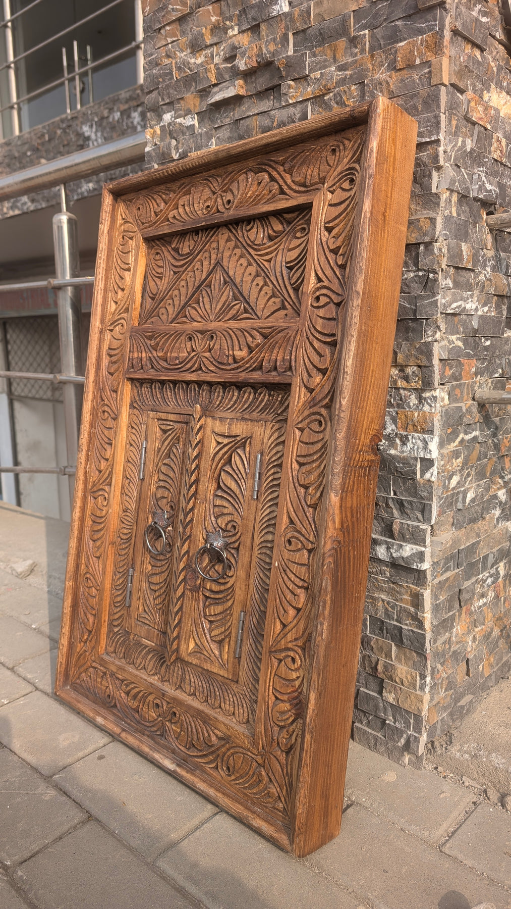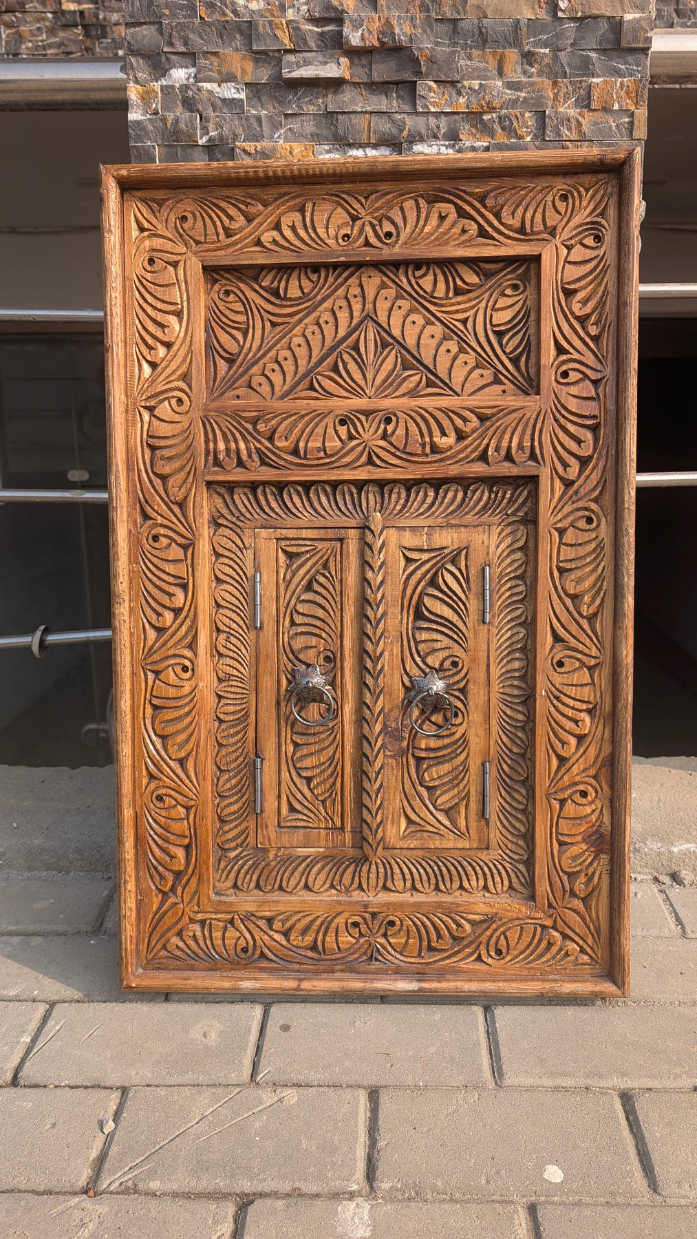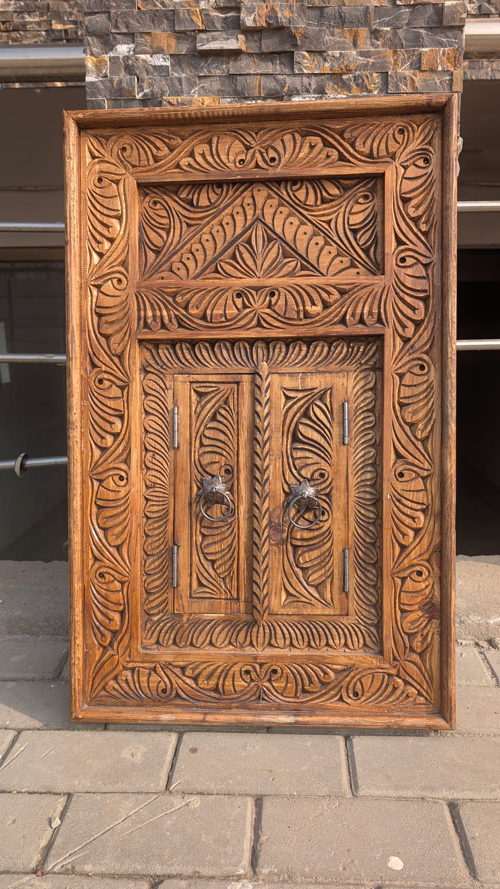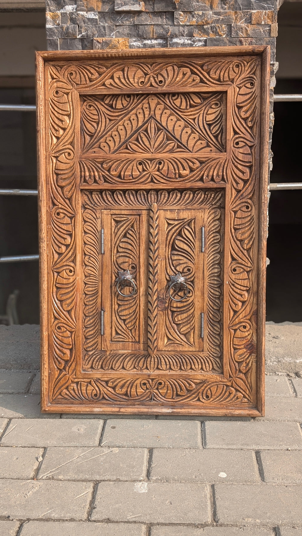 Hand-Carved Wooden Jharokha Wall Art – Vintage Window Frame with Doors